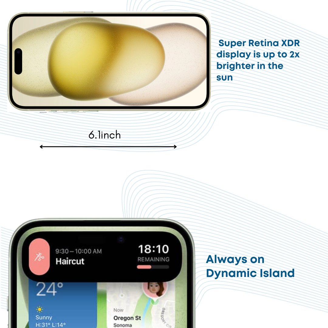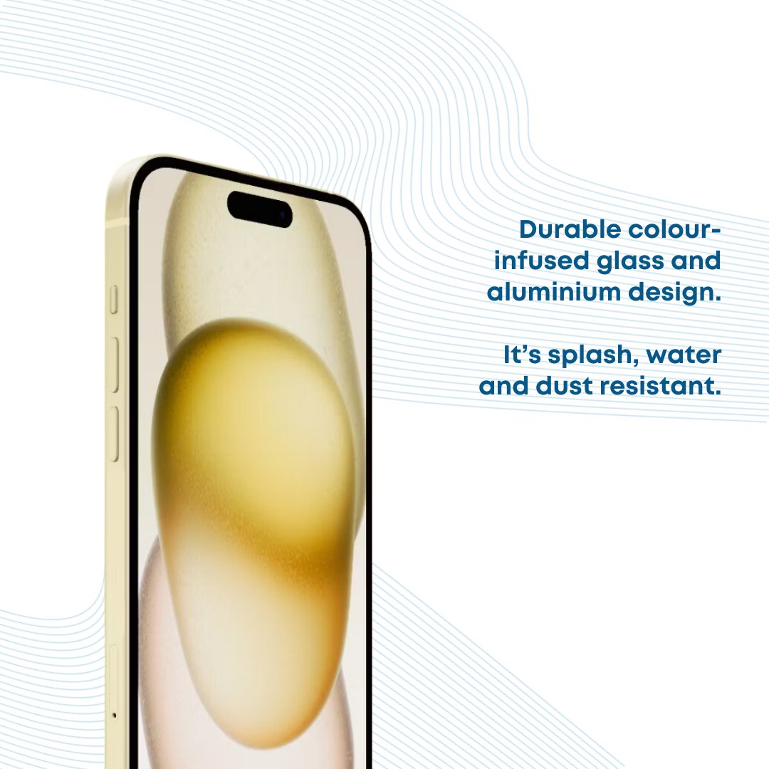 - INNOVATIVE DESIGN — iPhone 15 features a durable colour-infused glass and aluminium design. It’s splash, water and dust resistant. The Ceramic Shield front is super-tough. And the 6.1” Super Retina XDR display is up to 2x brighter in the sun compared with iPhone 14.